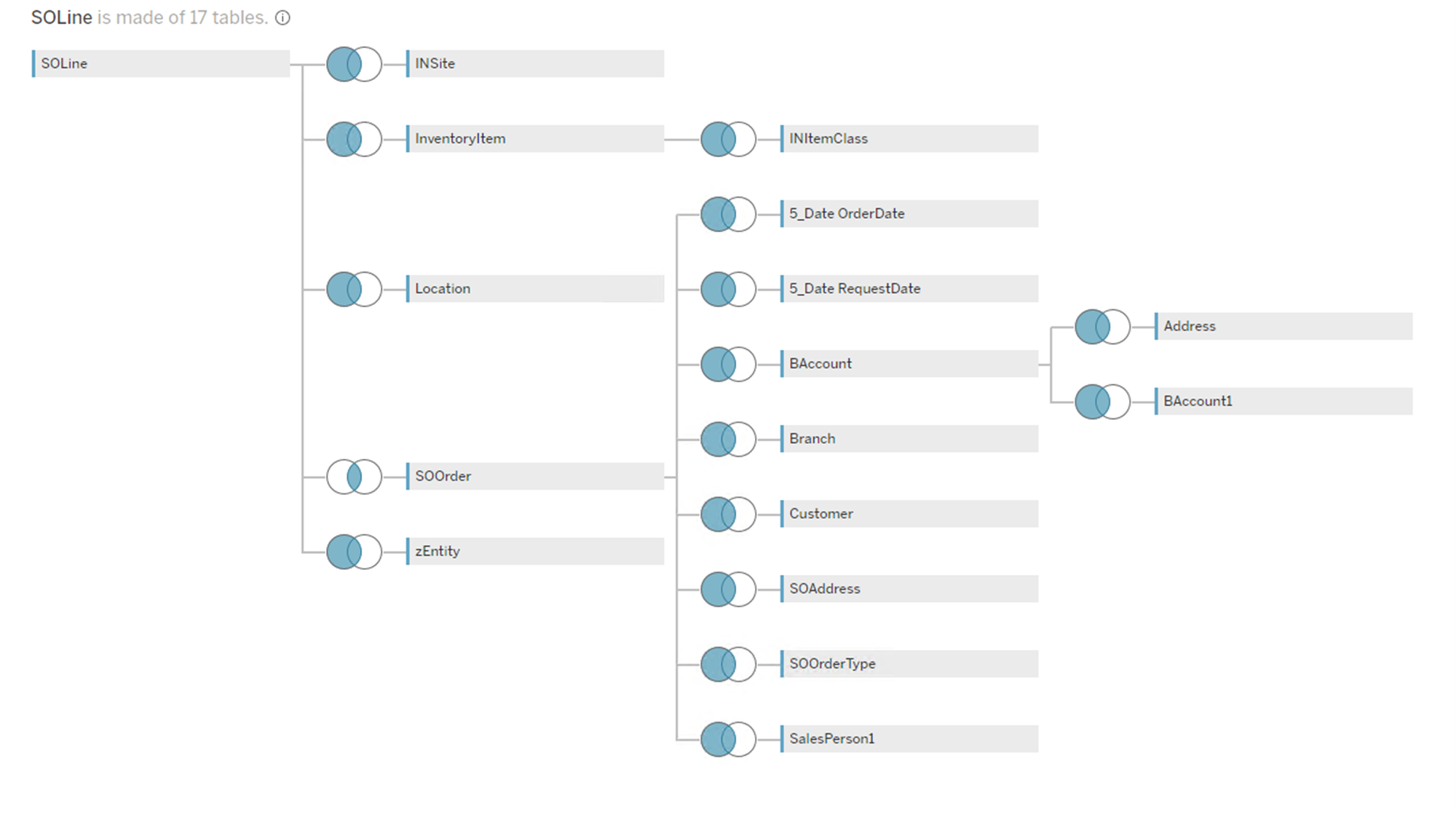 The Sales Order data source in this example that is a combination of the following tables.
