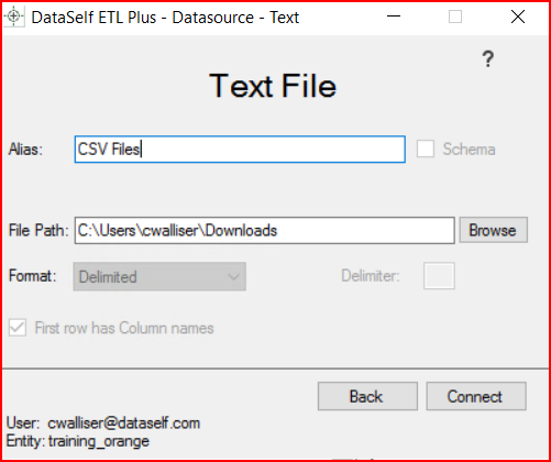 For CSV & TXT sources, the path is to the folder containing the csv or txt file(s). Then click on Connect