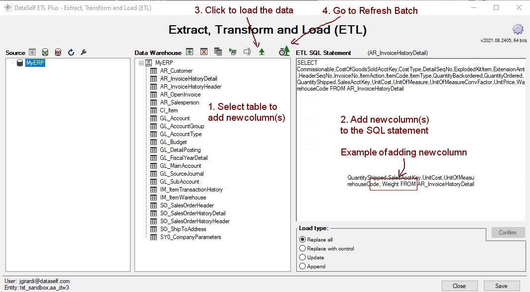 2. To add new columns edit the SQL in the ETL SQL Statement. In most cases, just add “,SourceTableColumnName" in the SELECT statement. See image.