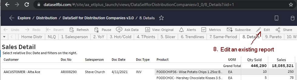 7. Open your DataSelf Analytics portal (Tableau OEM Web Server, https://dataselfbi.com). Edit a report from the modified Tableau data source.