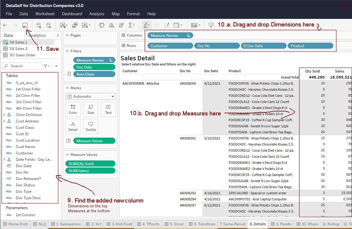 1. Select the InvoiceDetail table on the Data Warehouse panel (this table feeds the _Sales_Invoice Tableau data source).
