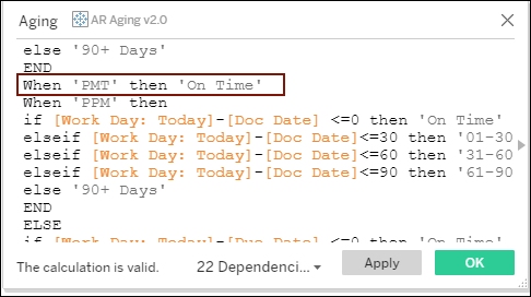 Example in AR Aging: Let’s change all transactions with Type = ‘PMT’ to be ‘On Time’: