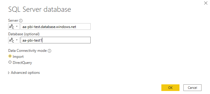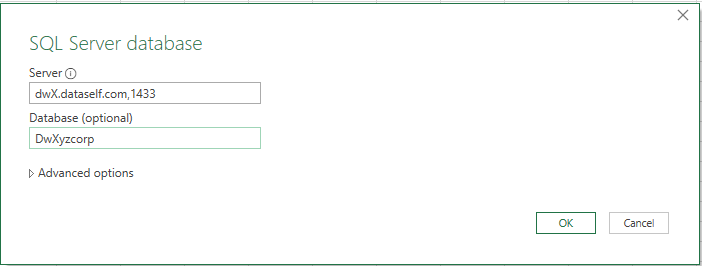 Server name: Enter the URL to your MS SQL data warehouse