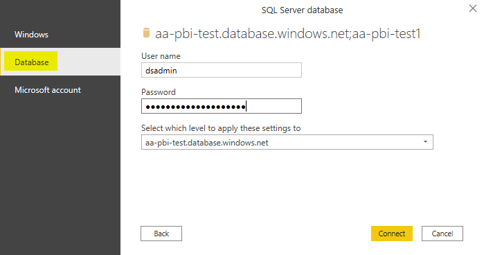 Databasethen inputUser nameandPasswordand select Connect.