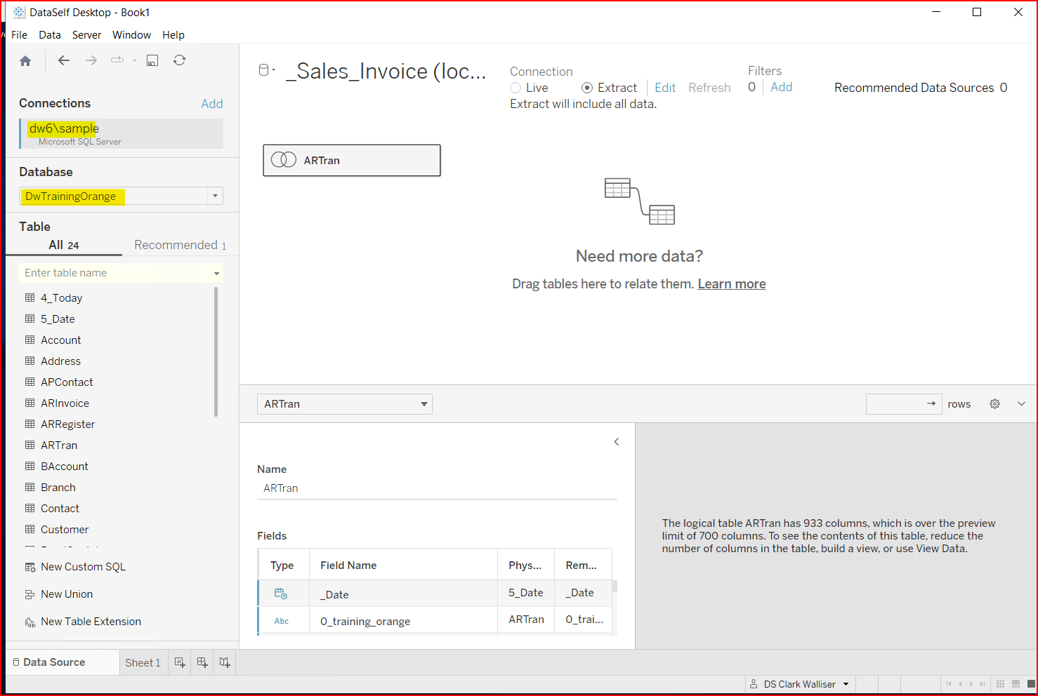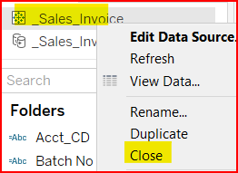 This will connect to the cloud Sales_Invoice Data Source on Sheet 1 ready to design a workbook. But in this case, we want to modify the Data Source, not design a new workbook. The challenge is that you cannot modify an online data source, it is fixed. You must download the Data Source to Create a Local Copy. You can modify a local Data Source, then re-publish it back to Tableau.