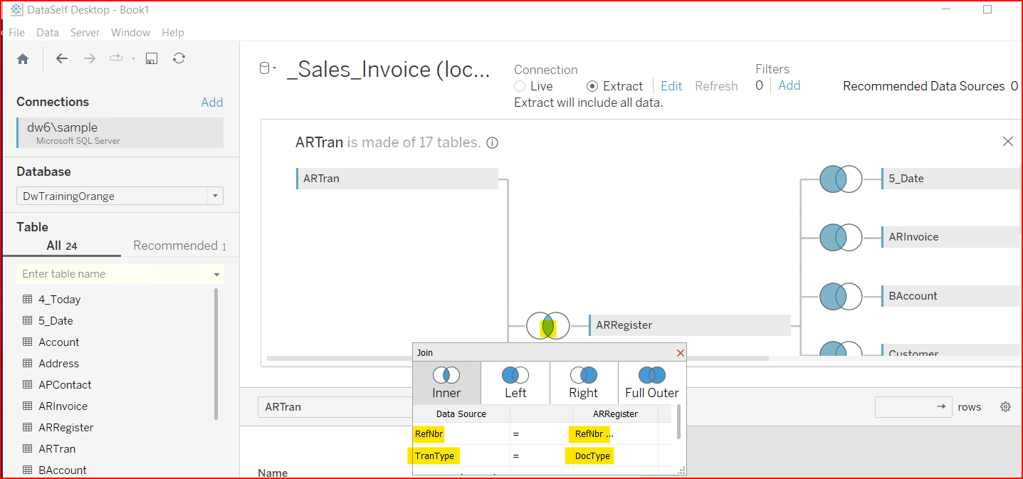 Click on the two circles icon to see the table join properties. In the screenshot below the unique link between records in the ARTran table and ARRegister table are ARTran.Refnbr = ARRegister.Refnbr and ARTran.TranType = ARRegister.DocType.