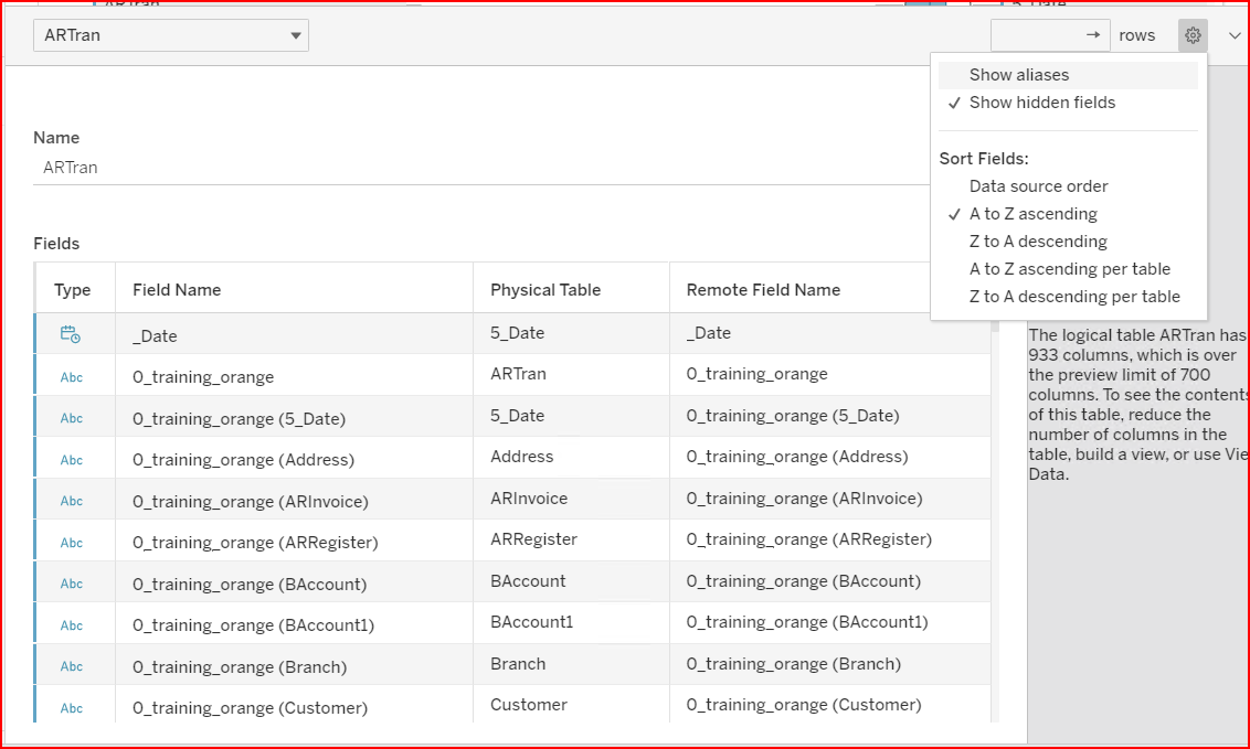 The Tableau Data Source Name shows at the very top. Within the data source is the Tableau field called ARTran. This is a Tableau object field that contains more information. The object name is simply the name of the first table within the object. To open the object, you can double click, right click and open, or click on the down arrow and open.