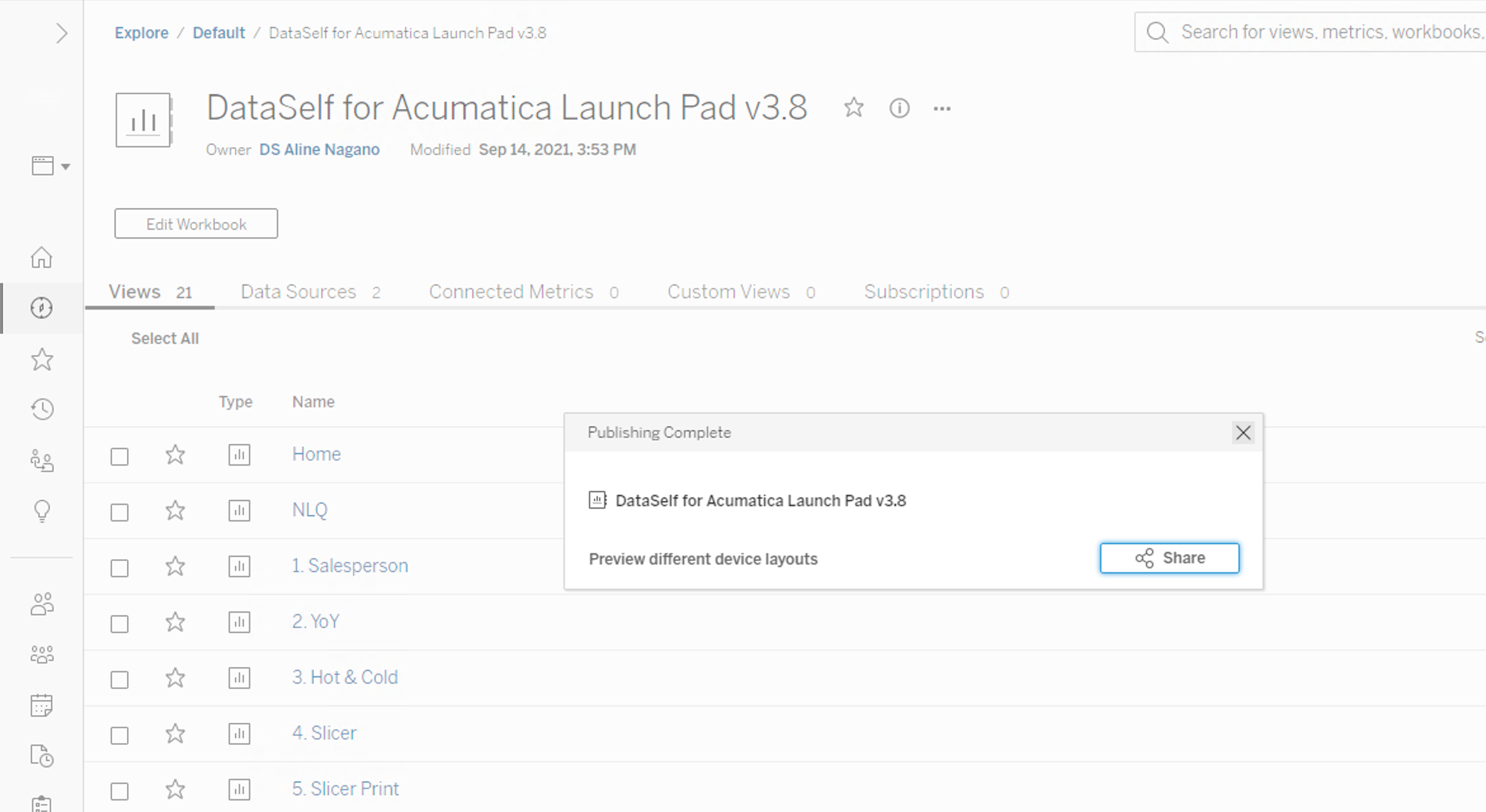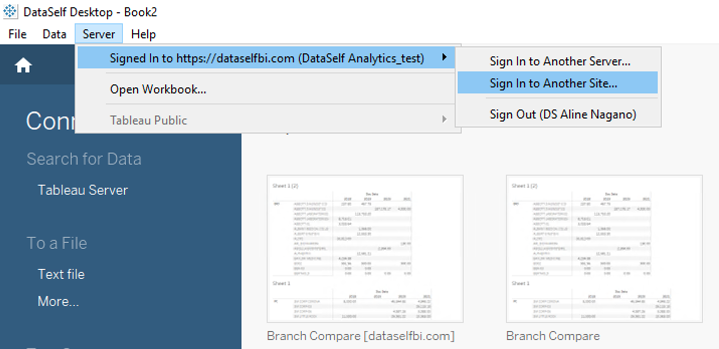 Select the Tableau site where the workbook is. In the example below, select DataSelf Analytics_test