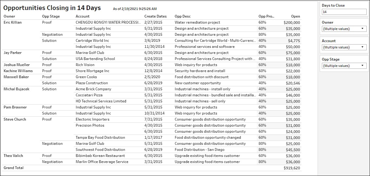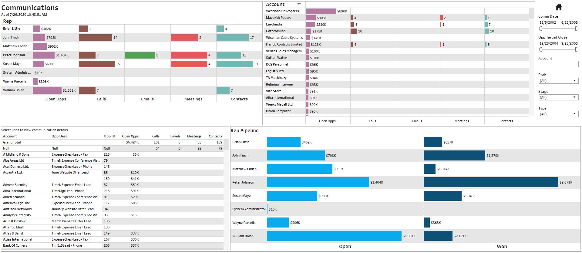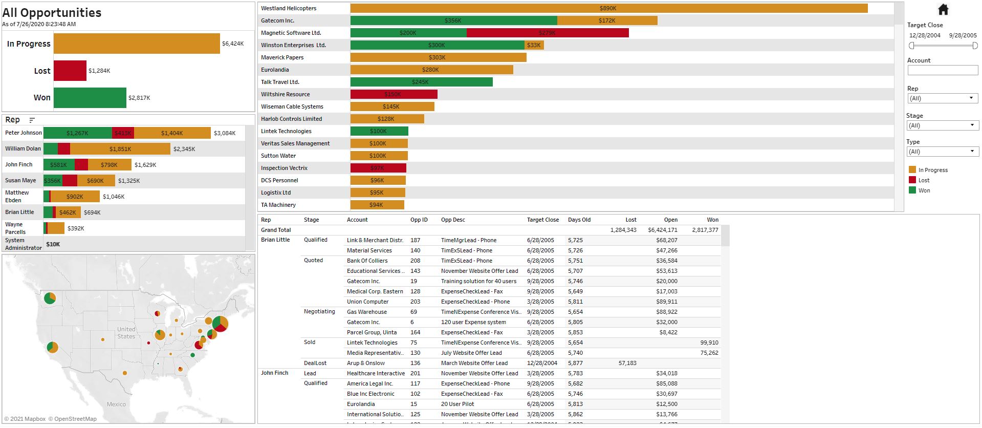 Monitor and slice and dice open opportunities by rep and other dimensions easily.