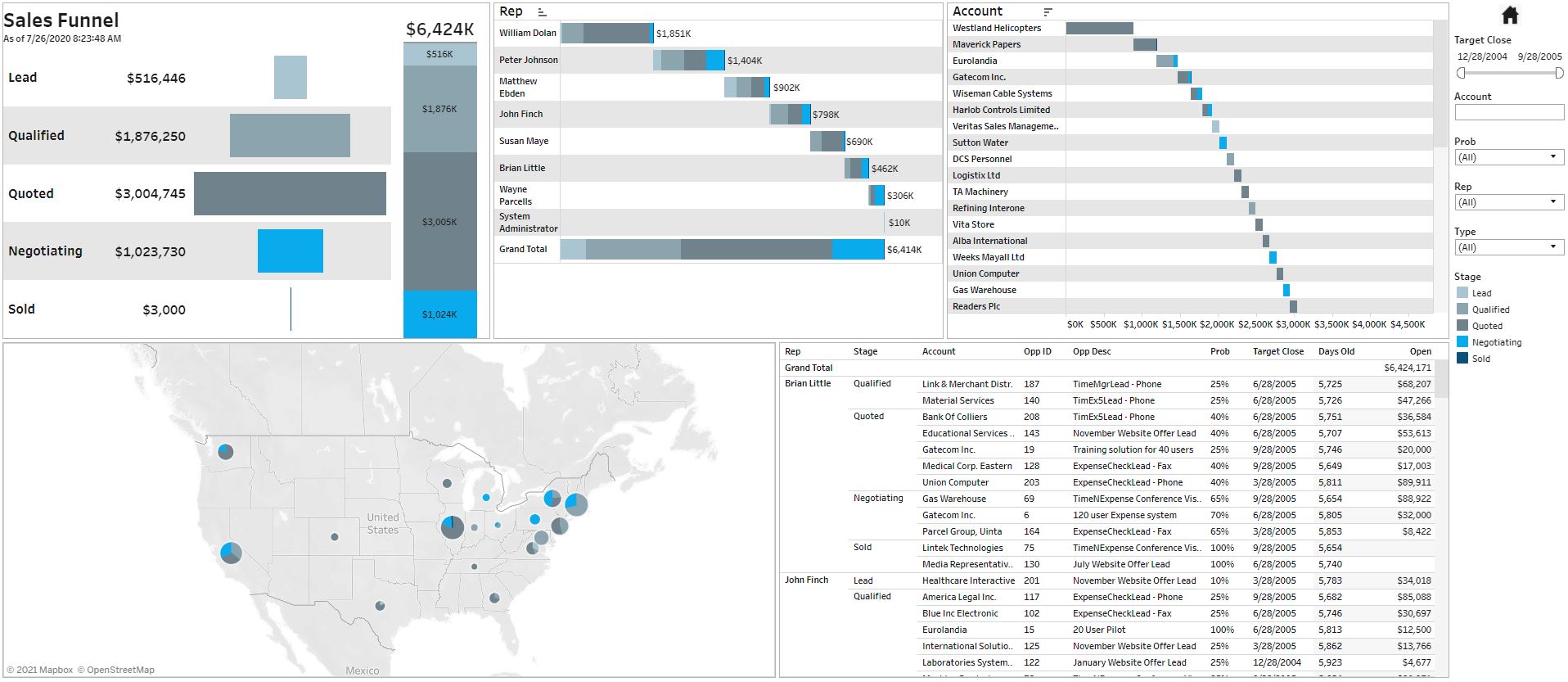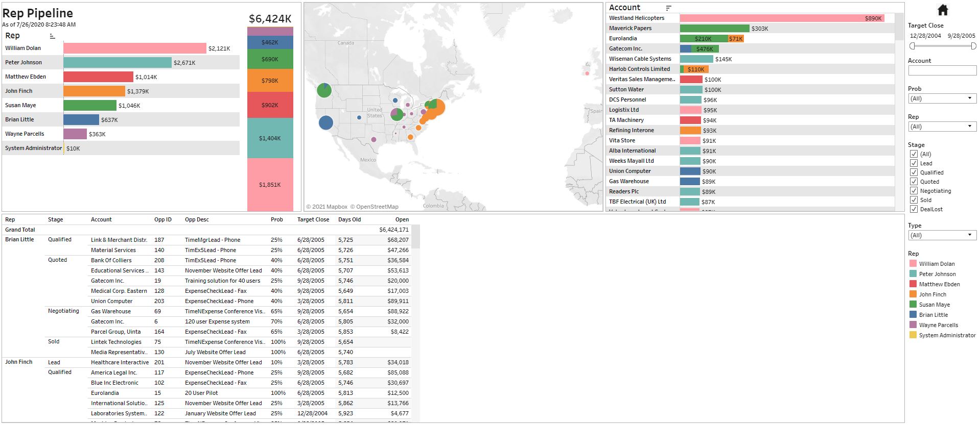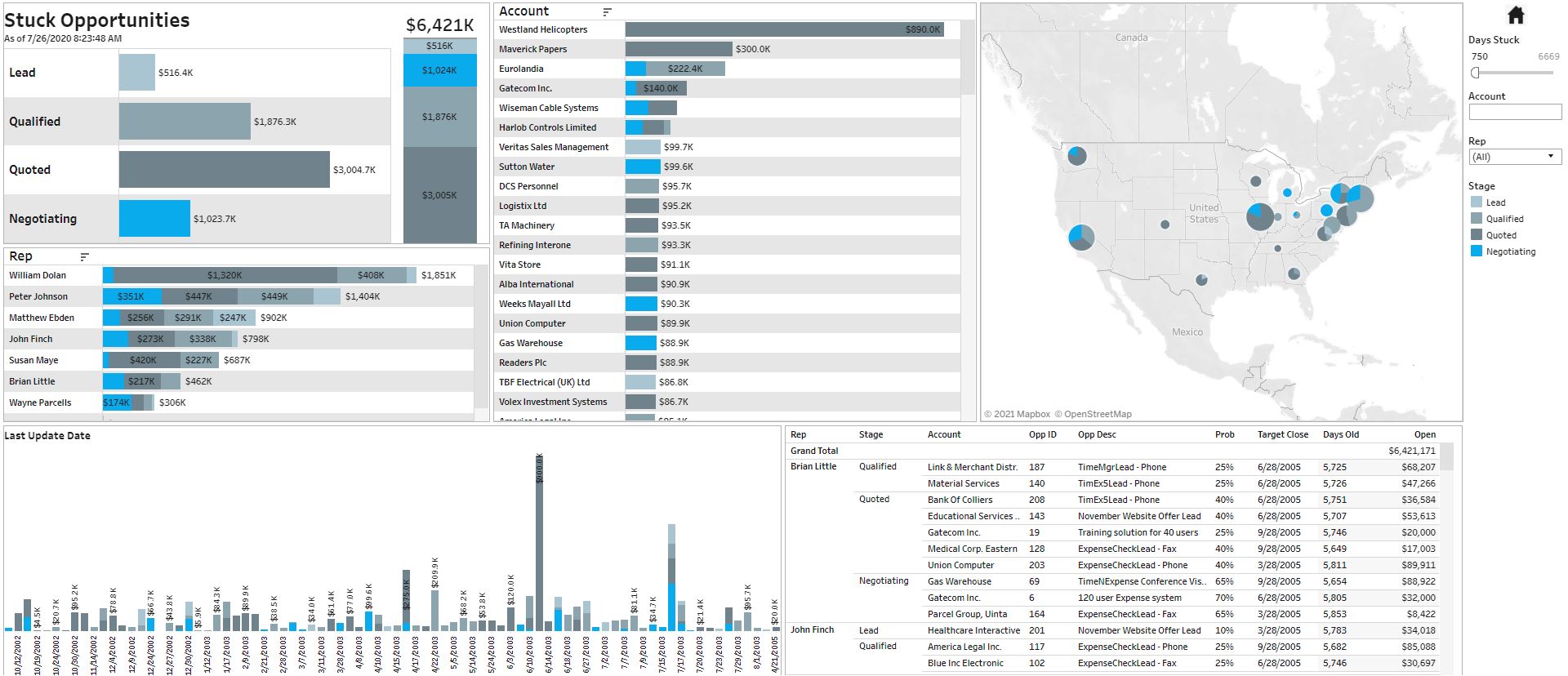 Monitor and slice and dice open opportunities by rep and other dimensions easily.