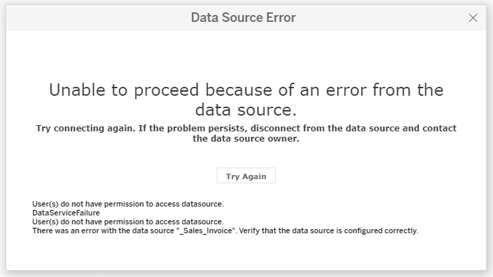 “Unable to proceed because of error from the data source.” “User(s) do not have permission to access”