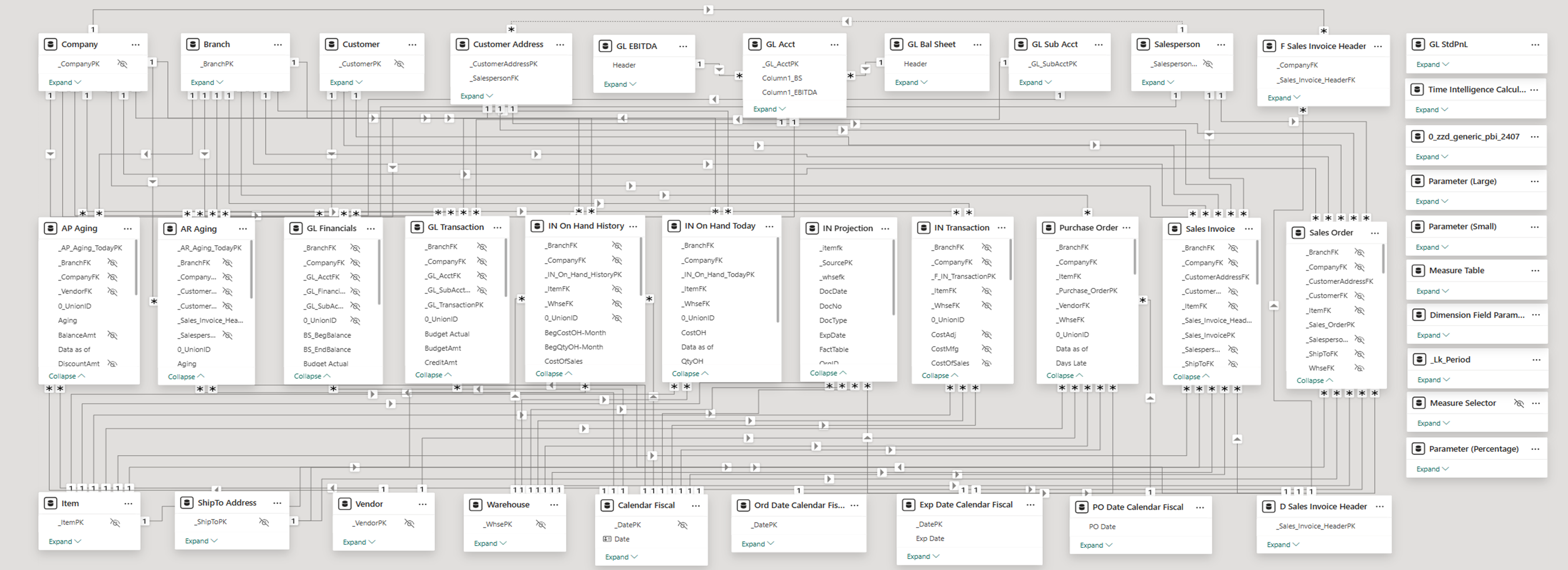 The following exemplifies how DFT+ tables are linked in DataSelf’s out-of-the-box templates in a galaxy schema arrangement. This model works in reporting tools such as Power BI, Tableau, and Excel.