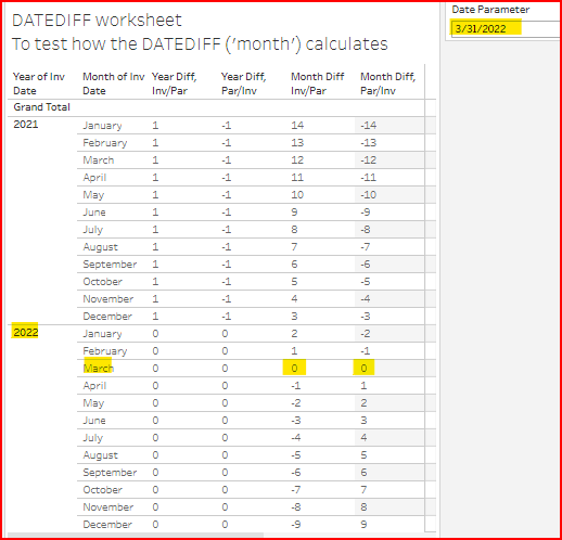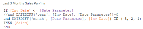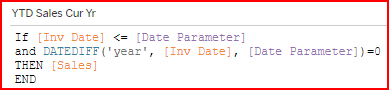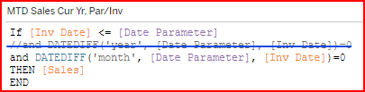 For MTD Current Year, limit the DATEDIFF ‘month’ value to zero for the current selected month. This eliminates the need for the DATEDIFF ‘year’ line. The day of the month is limited by the [Inv Date] <= [Date Parameter] .