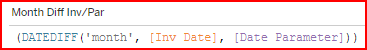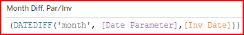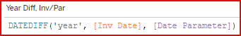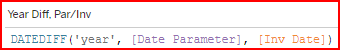 In the formula syntax, the difference is calculated as the 2nd date field minus the 1st date field. In the example, DATEDIFF ('year', [Inv Date], [Date Parameter]), the year of the [Date Parameter] is 2022.