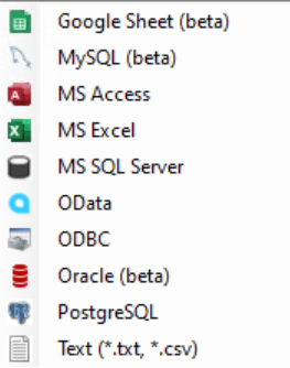 ETL+ Data Source List – list of source types, data stores, connection types and source systems (business software systems) supported by DataSelf.