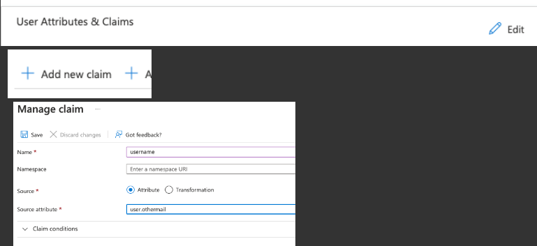 User Attributes & Claimsadding a new claim:usernamewith the valueuser.othermailand ensure that theUnique User Identifierclaim has the value:user.prinicipalname. ClickSave.