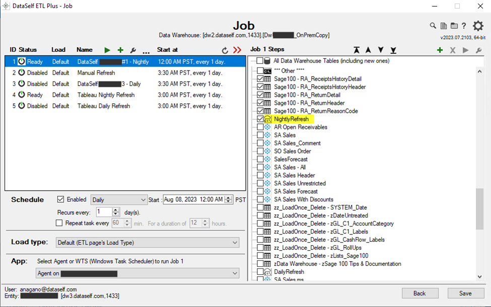 This job is not scheduled to run automatically in ETL Plus because it is going to be refreshed through the command in the bat file. The Agent runs that job on dw2.