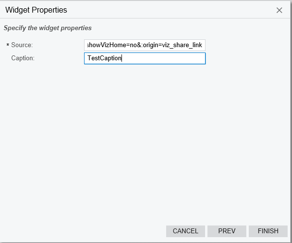 7. Paste that link into the "Source" section from the Widget Properties in Acumatica and optionally add a name in the "Caption" section. Click Finish, Click Design again.