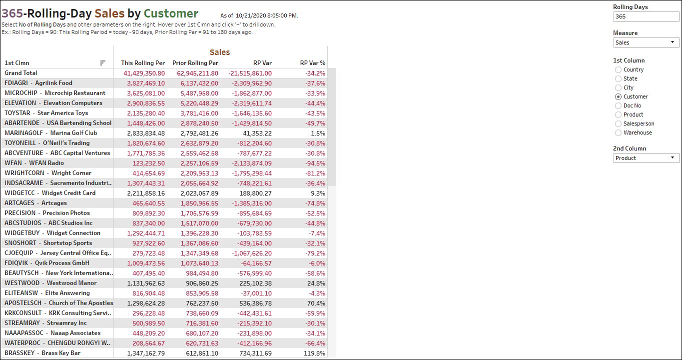 Select No of Rolling Days and other parameters on the right. Hover over 1st Clmn and click ‘+’ to drilldown. Ex.: Rolling Days = 90: This Rolling Period = today – 90 days, Prior Rolling Per = 91 to 180 days ago.
