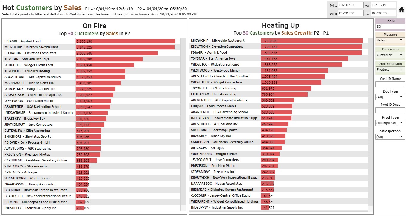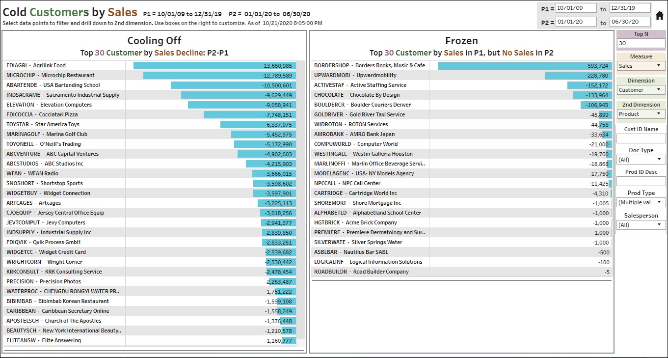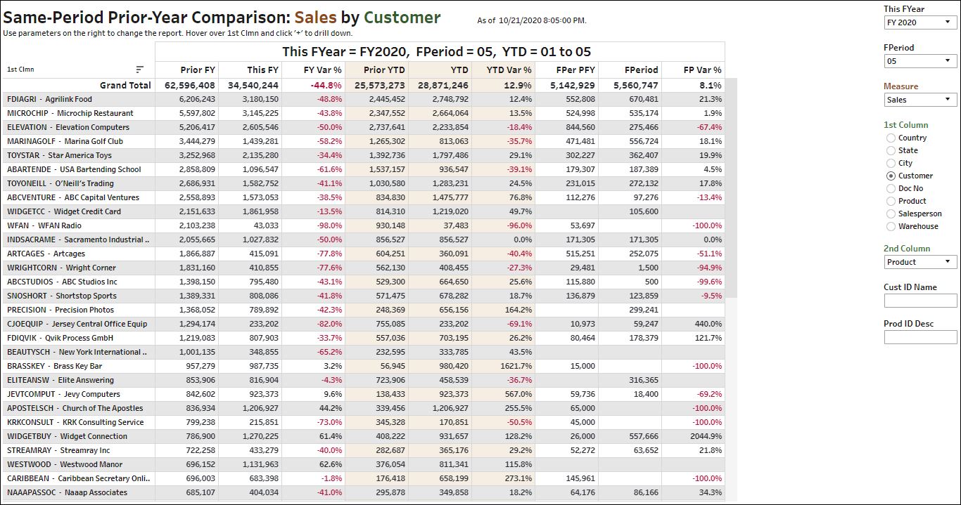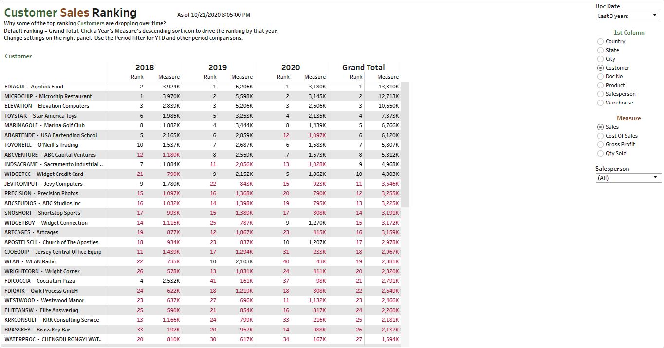 Why some of the top ranking Customers are dropping over time? Default ranking = Grand Total. Click a Year’s Measure’s descending sort icon to drive the ranking by that year. Change settings on the right panel. Use the Period filter for YTD and other period comparisons.