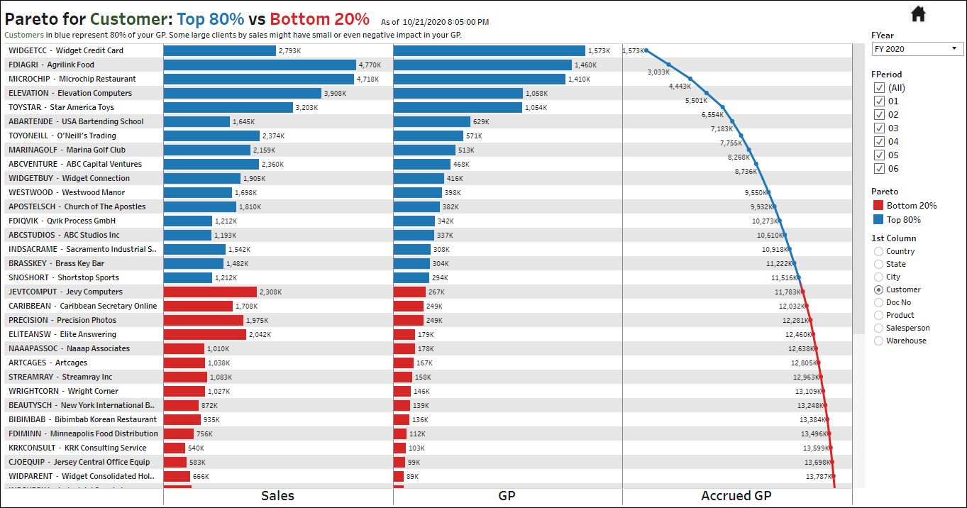 Entries in blue represent 80% of your GP. Why some large entries by have small or even negative impact in your GP. Use parameters on the right to set entries as customers, products, regions, etc.
