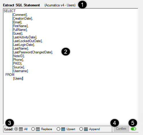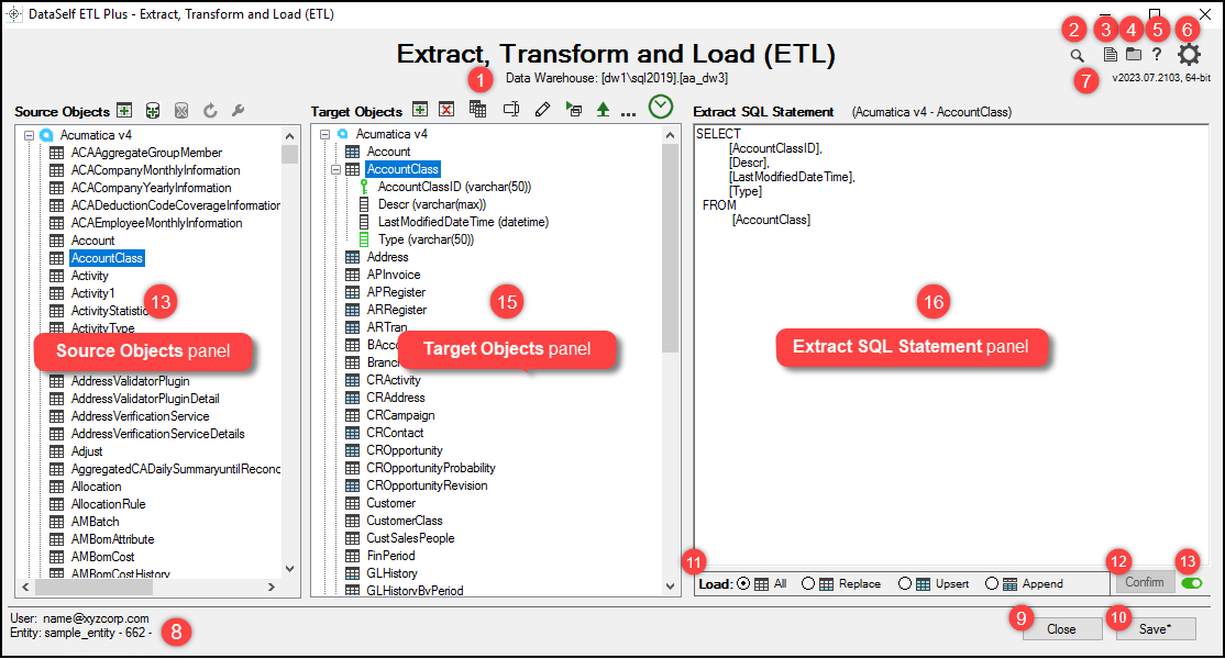 SQL statements in the Extract SQL Statement panel of ETL+ Extract, Transform and Load (ETL) window must work with the SQL syntax supported by the ETL+ source driver used to connect to the Source Object.