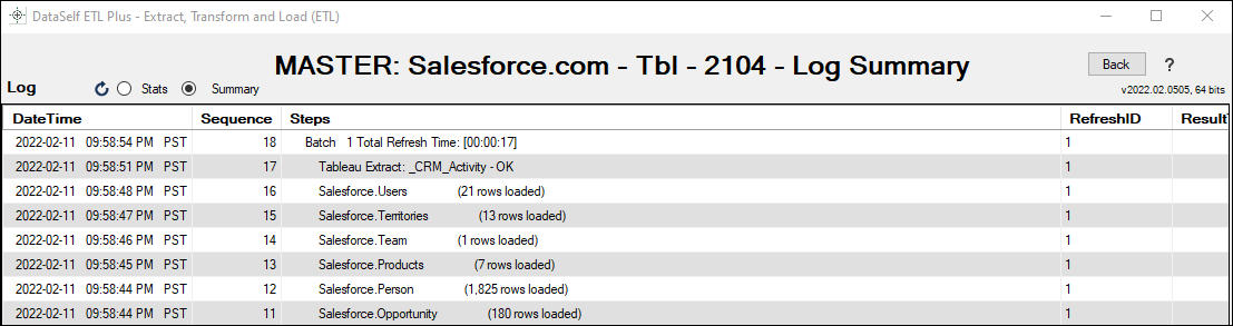 Logicon. Log page help here.Scroll down on the log page and double-check that no table load failed, and the row count matches with the Salesforce tables. Following is an example highlighting two tables and their loaded row count.