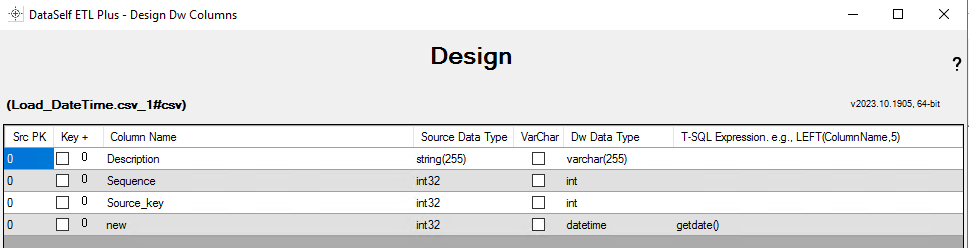 For this example the SQL in the Extract SQL Statement panel and the Design page was customized to include a date-time stamp in the new column. The column is assigned the current date-time when when Load Append is run.
