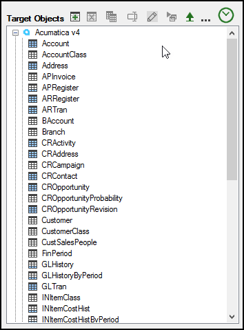 Account, AccountClass, down to INItemCostHistByPeriod are target tables in the Acumatica v4 data warehouse.