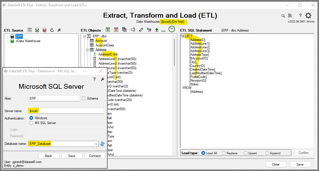 AddressID (int), AddressLine1 (varchar(50)),etc.ETL SQL Statement for the Address table (right panel)