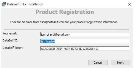 ETL+ license validation: Look for your ETL+ registration email for Email, Entity ID, Token; press Next.