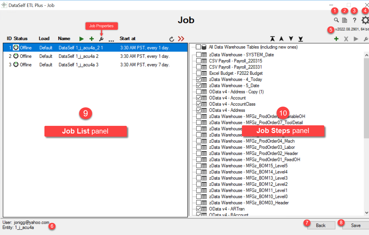 Jobs are shown in the Job List panel and the Job’s steps are shown in the Job Steps Panel.