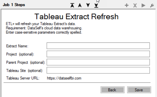 Allows the refresh of Tableau Extracts directly from ETL+ either manually or as part of Jobs.