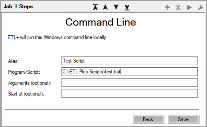 For more see Passing Arguments to Command Line Scripts in ETL+Start at (optional). Folder to run the script (usually not needed).
