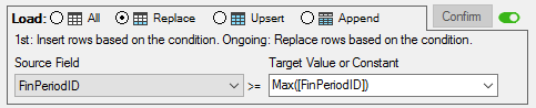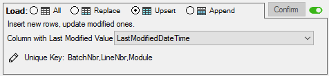The Load panel specifies how data is extracted from it’s source and loaded into the target table in the data warehouse. The load types available on the Load panel are Load All, Load Replace, Load Upsert, and Load Append.