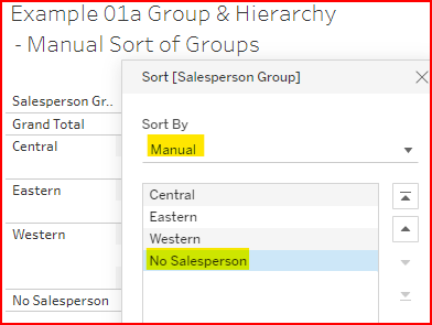 To show in the order: Western, Central, Eastern, No Salesperson, use the Manual Sort feature