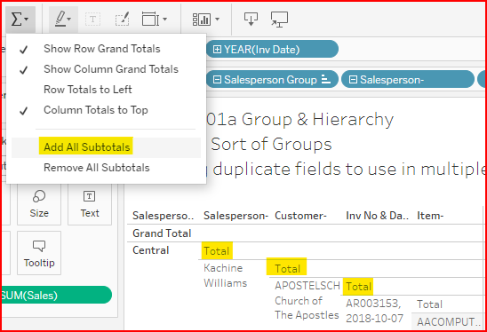 3. The hierarchy expands from Grand Total to Salesperson Territory with the subtotal showing the grand total value.