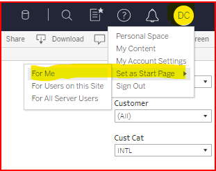 Some people want Tableau to open on the page of their choice. To set your current page as the opening home page click on your profile icon in the upper right and select the start page options.