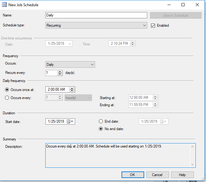 2. This window will open. Name will be empty. In this example, we will create a Job which runs a Tableau Extract Refresh. Owner: Enter sa