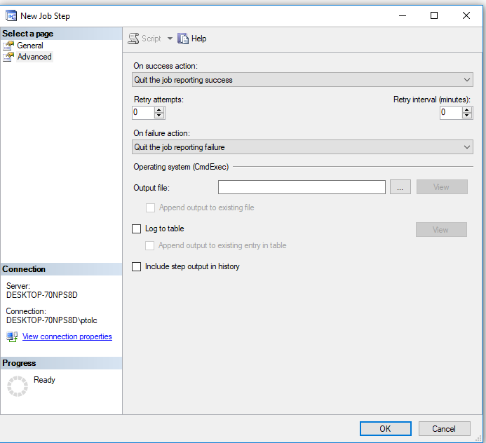 5. For On success action: Pick - Quit the job reporting success. This value is picked if there is only one step in a job or if there are many or if it's the last step. When there a many steps, pick - Go to the next step. Now click OK.