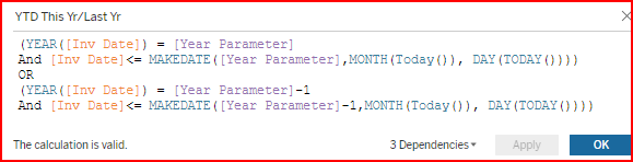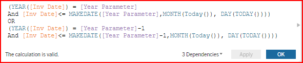 4. If you want to create a T|F calculation to evaluate YTD dates for multiple years, add to the existing logic adding or subtracting from the Year Parameter for the Year part of the date. In the example below, the OR command was added with another date condition for [Year Parameter] - 1
