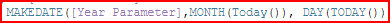 In the following examples the Year part of the date is provided by a Parameter field. The Month and Day parts of the date are provided by Today’s date using the Today function. This is often used for YTD & MTD filter/selection calculation fields.