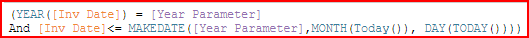 3. Use the MAKEDATE value in the T|F calculation to evaluate when the Year of the Invoice Date equals the Year parameter value, and the Month/Day of the Invoice Date is less than or equal to today’s Month/Day.