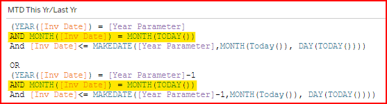 (MONTH ([Inv Date] = MONTH (TODAY ()) to select the specific month. This needs to be added to both sections of the calculation for the current and prior year.