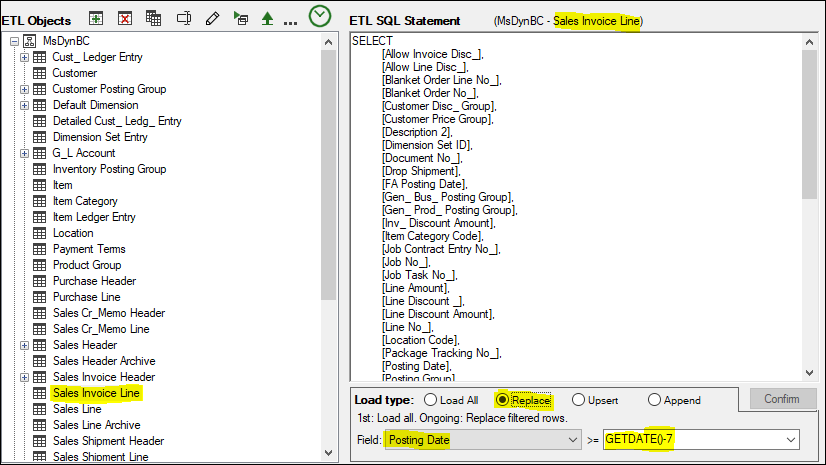 The following is an example of Sales Invoice Line using the Replace feature. This example only updates the last 7-days worth of transactions.