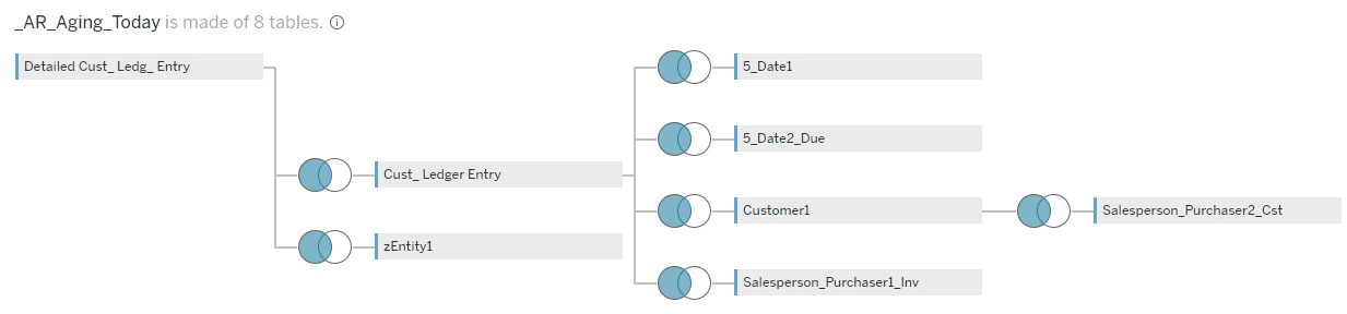 The following is an example of how MS Dynamics BC _AR_Aging_Today tables are linked in DataSelf’s out-of-the-box templates. This linking applies the same way for Tableau data sources, Power BI data sets, Excel, and other reporting tools.