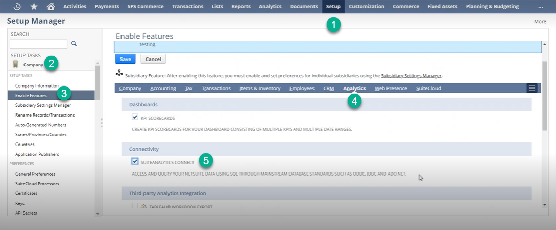 Oracle NetSuite portal → Setup Tab → Company → Enable Features → Analytics > SUITEANALYTICS CONNECT in Connectivity section.