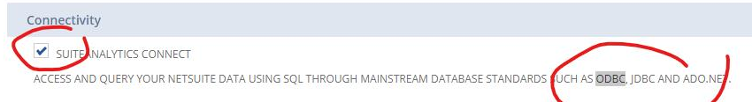 The Suite Analytics Connect feature must be enabled in NetSuite Portal. (This feature is not to be confused with the SuiteAnalytics Workbook feature).