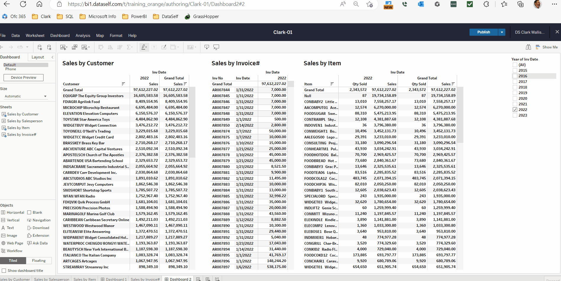 Create a dashboard displaying Sales by Customer, Sales by Invoice#, and Sales by Item worksheets.