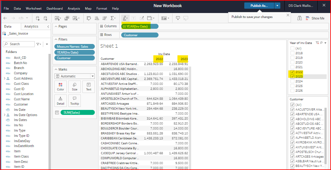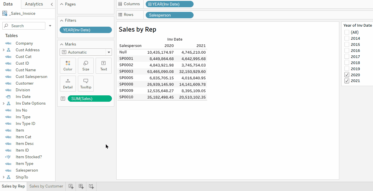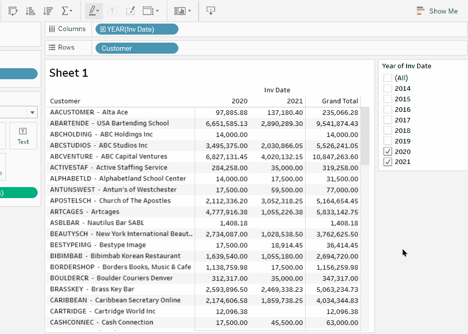 YEAR(Inv Date)dimension field on the Columns. Select the Show Filter property.In the Year of Inv Date filter on the right, unselect All, then check the boxes for the last two years.